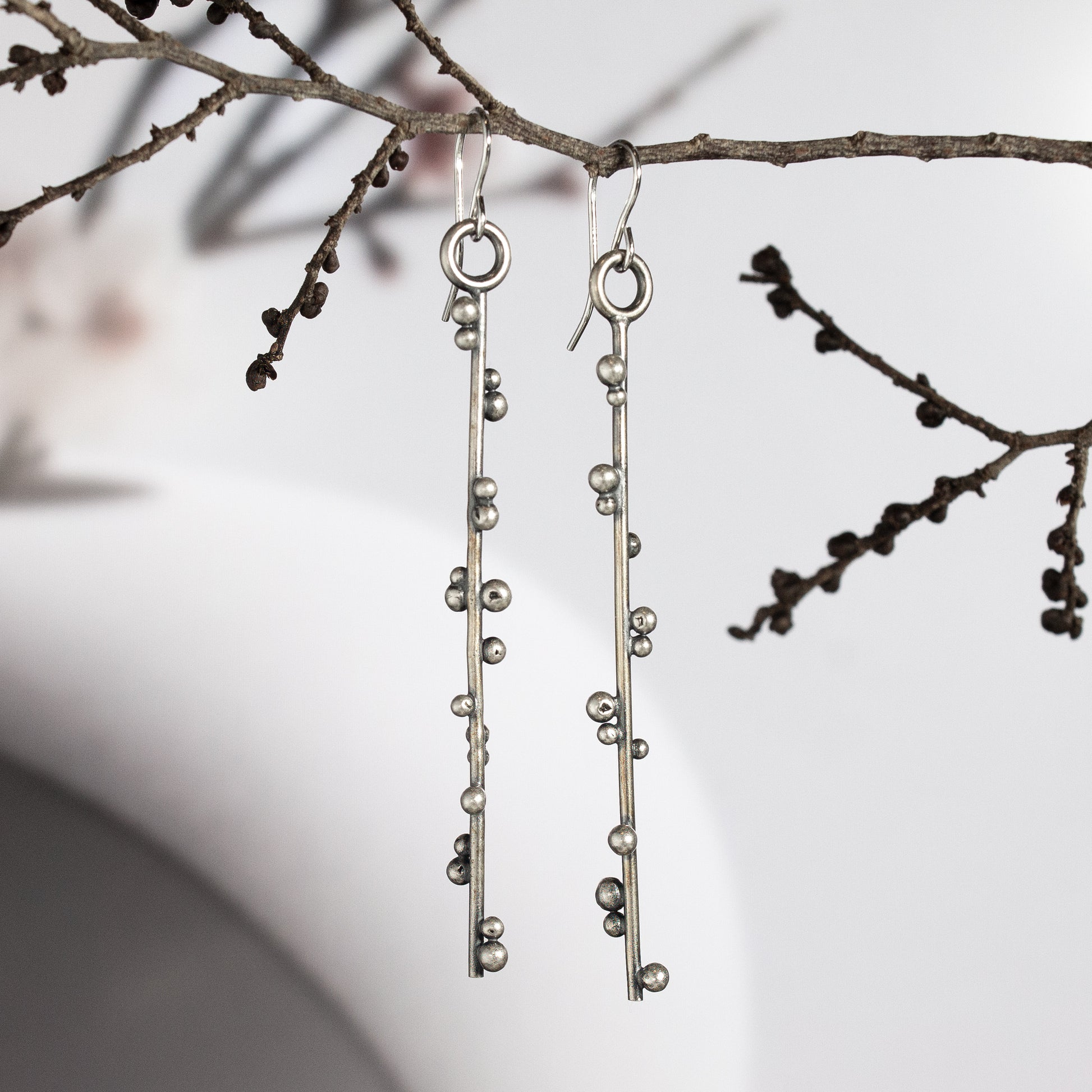 Sterling silver wire scattered with sterling granulation and hung from French ear wires. This pair is 2-7/8" long including the ear wire. The granulation varies from 2-3mm round.