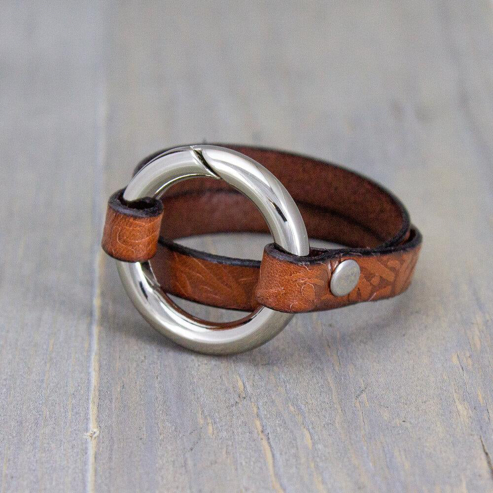 10mm embossed mahogany leather, finished with a 1-1/2" nickel spring-gate clasp. Medium bracelet fits wrists up to 6-3/4".