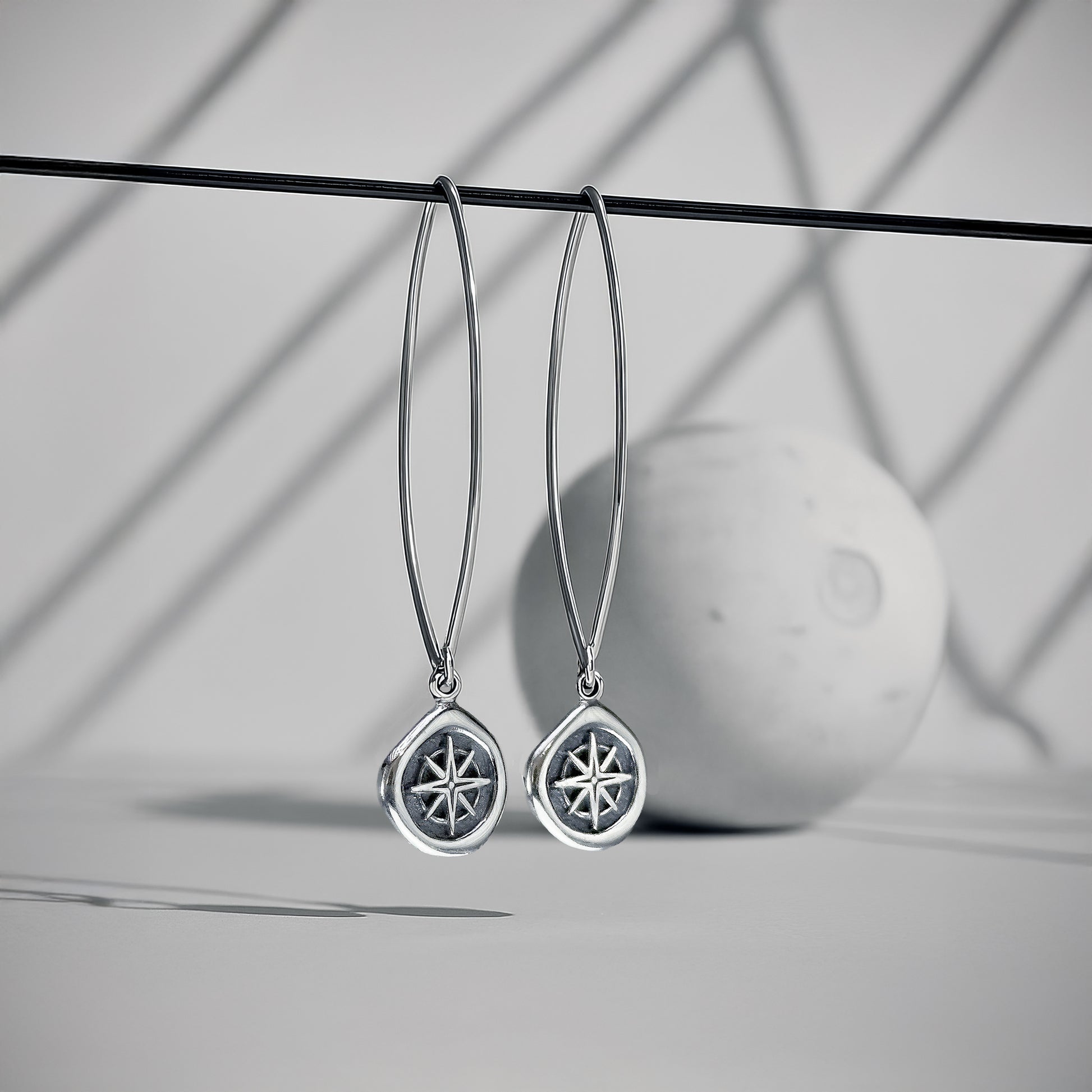7/16" compasses hung from sterling ear wires. The total length of the earrings is 2-1/8".